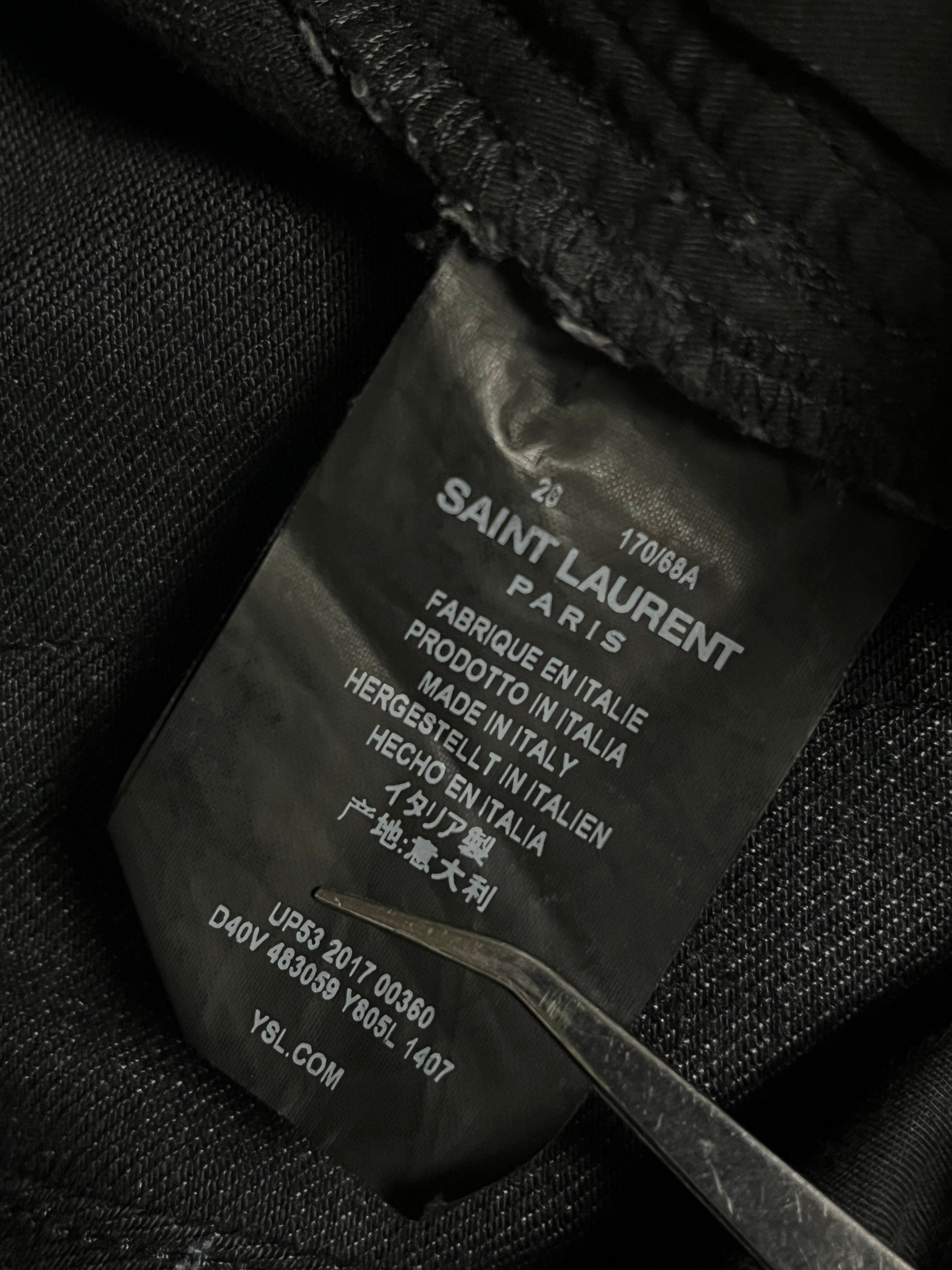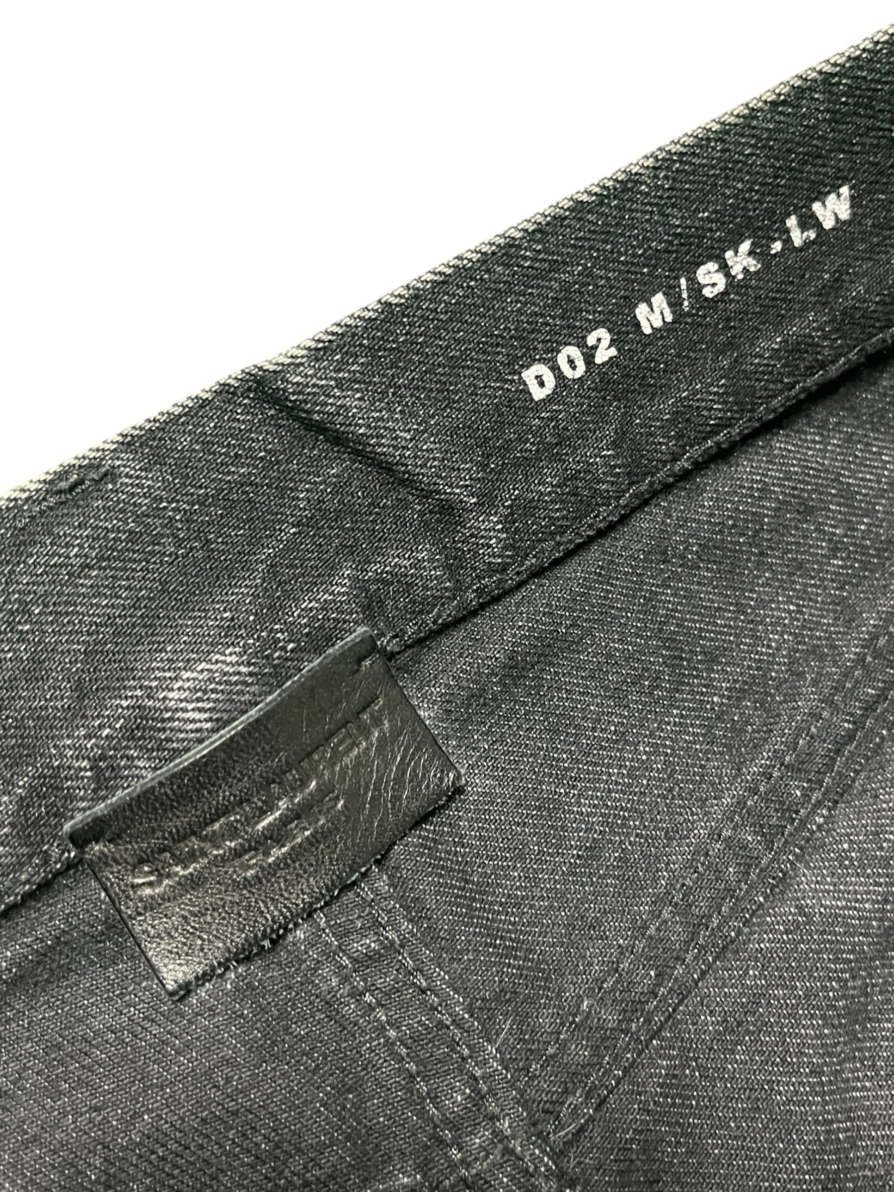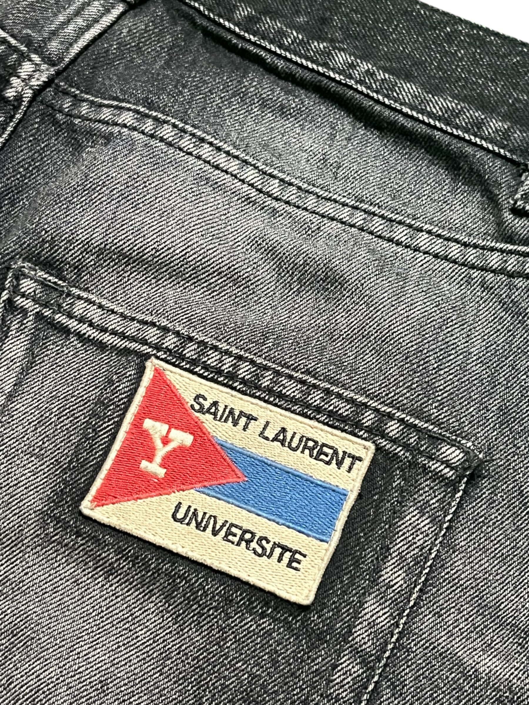 Pantalon en denim ajusté noir orné d'une broderie sur la poche arrière.