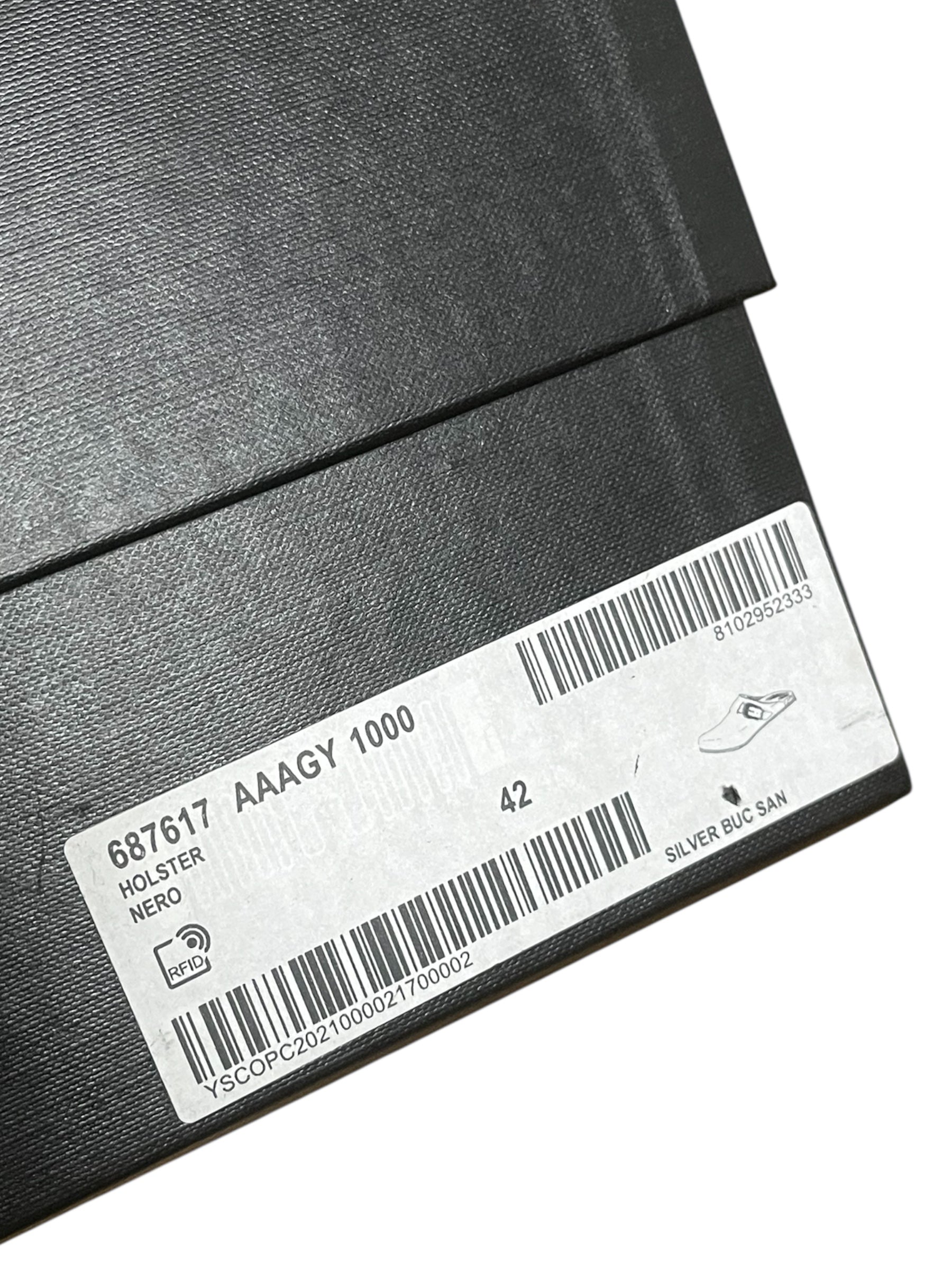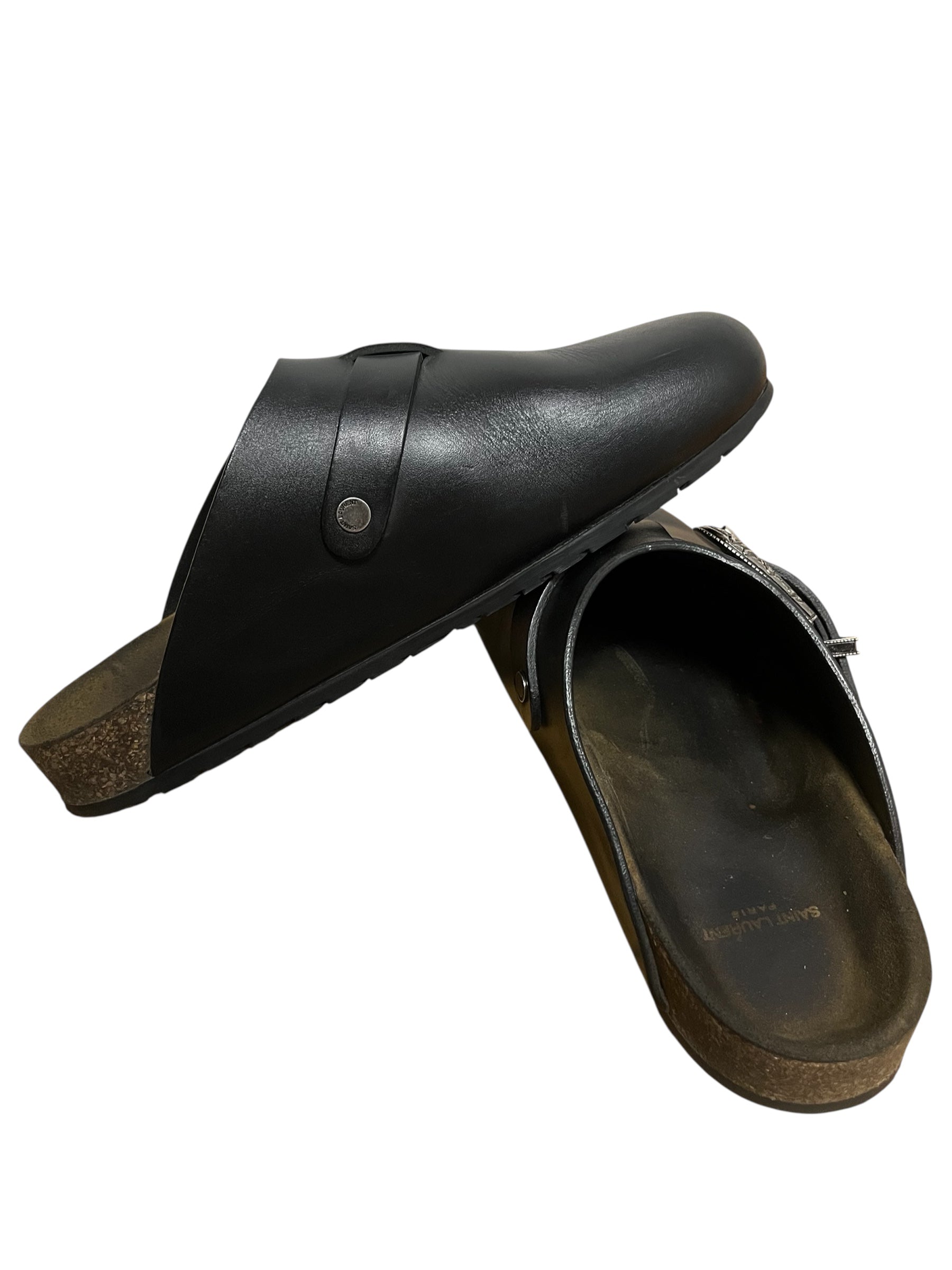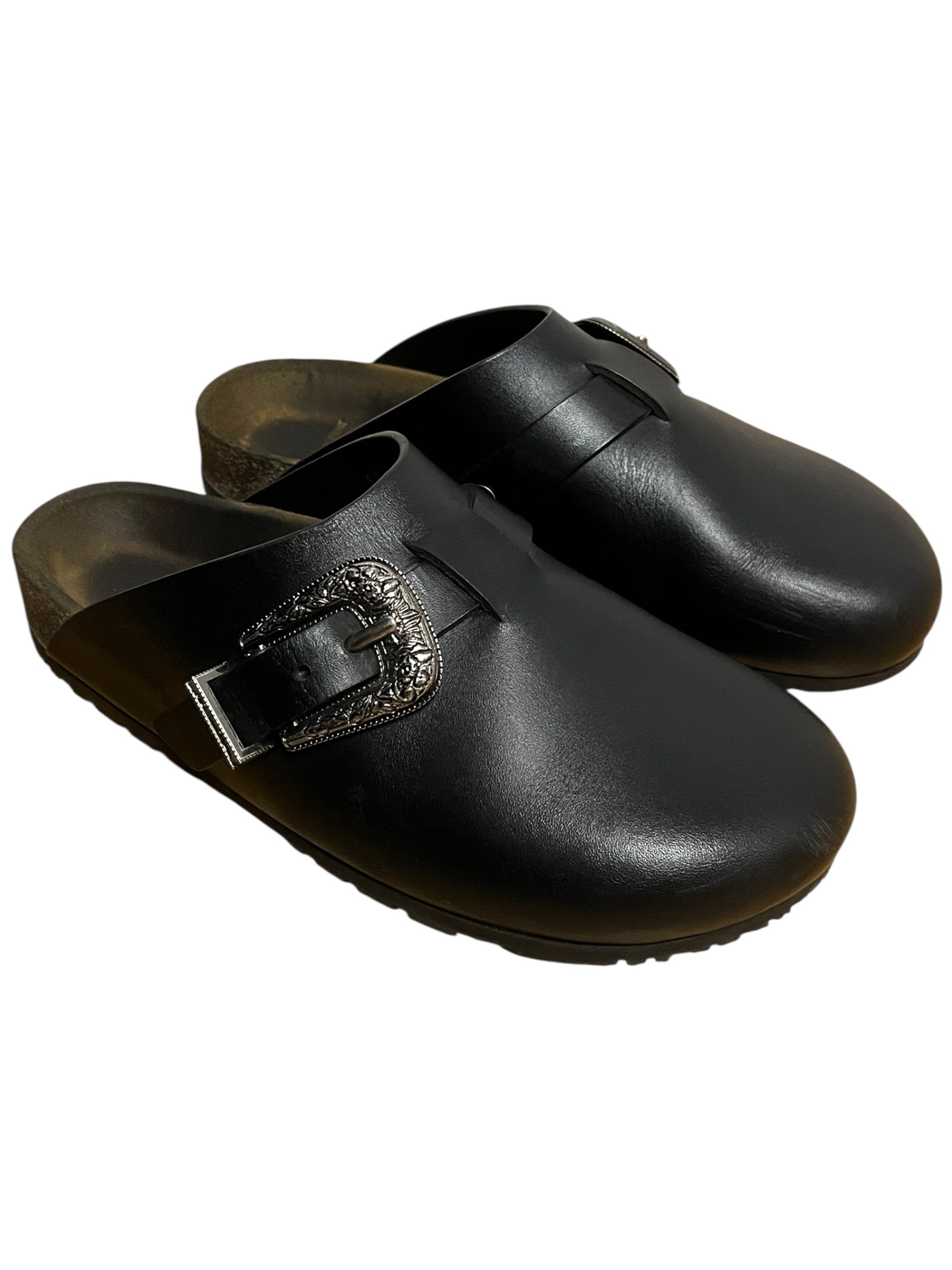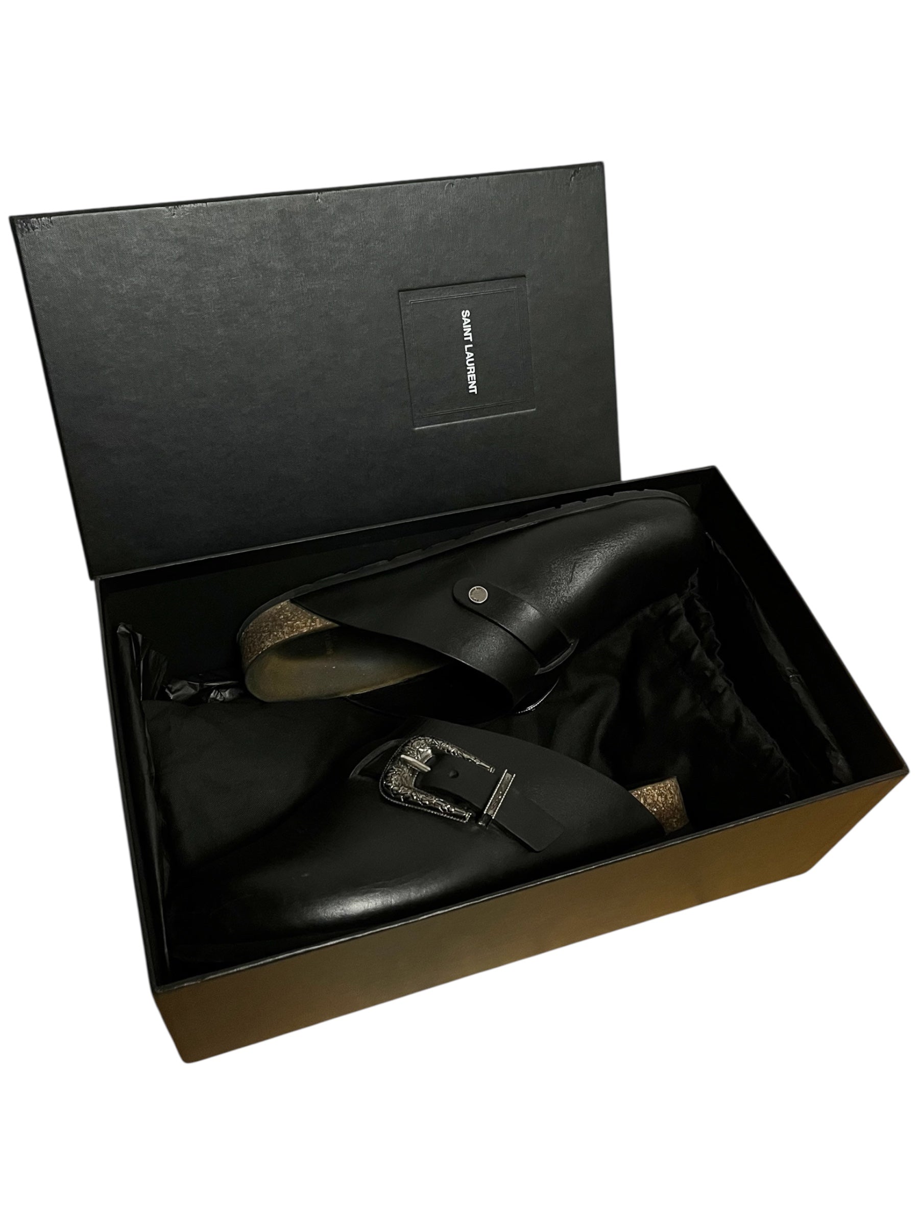 Sandale en cuir noire ornée d'une boucle en métal style western. La paire vient avec la boîte.